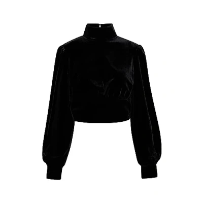 Stretch Velvet Blouse Stand-up collar with rhinestone buttons Wide waistband with side zip Puff sleeves with cuffs Rhinestone buttons on the sleeve ends