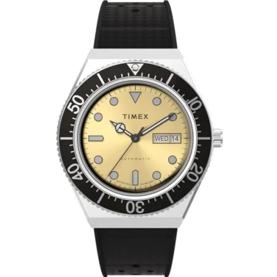 Round stainless steel 40 mm case completed with stainless steel synthetic rubber strap and buckle clasp Champagne analog display, featuring baton markers Automatic watch, strap fits wrist circumferences 150-205 mm Acrylic lens Water resistant to 50m (165 ft): in general, suitable for short periods of recreational swimming, but not diving or snorkeling