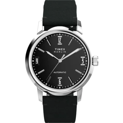 Ticking inside this iteration of our iconic 1960s Marlin is a tried-and-true 21-jewel Japanese automatic movement, creating a contemporary timepiece that honors our watchmaking history. This Analogue watch has a Calendar function: Date as well as Luminous Hands High quality 21 cm length and 19 mm width a Black Leather strap with a Buckle Case diameter: 40 mm,case thickness: 13 mm, case colour: Silver and dial colour: Black Water resistant: 5 bars -Weight: 55 g The watch is delivered in an original gift box and has a warranty of 2 years