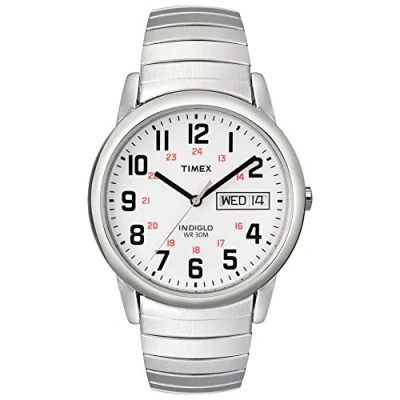 Silver-tone 18mm stainless steel expansion band fits 6-to-8-inch wrist circumference White easy-to-read dial with day & date window at 3 o'clock; full Arabic numerals Silver-tone 35mm brass case with mineral glass crystal Indiglo light-up watch dial