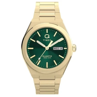 The Q Timex Continental embodies the striking style and decadent glamour of 1970s West Hollywood, adding new sophistication to our esteemed Q Timex collection. This analogue watch features a calendar function (day date) and is equipped with luminous hands - iconic retro chic meets modern elegance. High quality gold stainless steel bracelet, 21 cm long and 21 mm wide, with a folding clasp with push button closure. Case diameter: 39 mm, case height: 9 mm, case colour: gold, dial colour: green Waterproof: 5 bars -Weight: 109 g The watch comes in a beautiful, original gift box and has a 2 year warranty