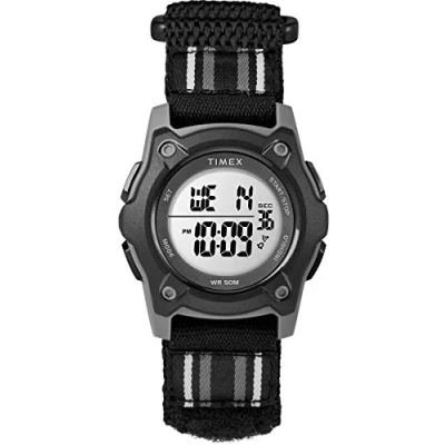 Adjustable black/gray striped 18mm double-layered nylon Fast Wrap strap fits up to 6-inch wrist circumference Black 35mm resin case with acrylic lens; easy-to-read gray digital display; Indiglo light-up watch dial Water resistant to 50 m (165 ft): In general, suitable for short periods of recreational swimming, but not diving or snorkeling Chronograph, alarm & day-date calendar Timex Kids Loss Protection Plan
