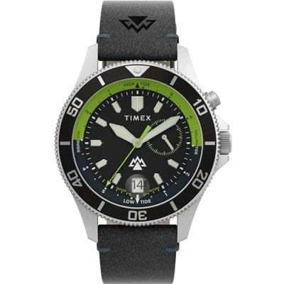 Time and tide wait for no man. Luckily, the Expedition North Slack Tide keeps track of both. This Analogue watch has a calendar function: Date , Tide , Luminous Hands , Luminous Numbers and Screw Down Crown High quality 21 cm length and 19 mm width Black Leather strap with a Buckle Case diameter: 41 mm,case thickness: 13 mm, case colour: Silver and dial colour: Black Water resistant: 20 bars -Weight: 90 g The watch is delivered in an original gift box and has a warranty of 2 years