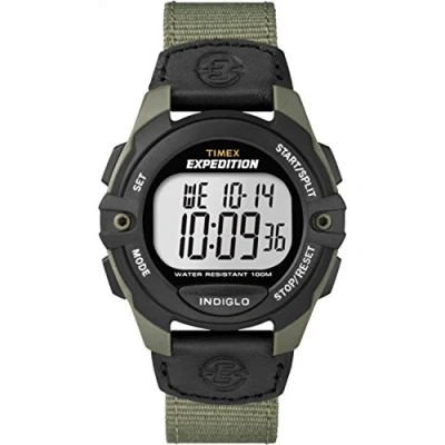 Adjustable green 18mm nlyon strap with black genuine leather trim fits up to 8-inch wrist circumference 1-hour chronograph with lap and split times; 24-hour countdown timer; month, day and date calendar 3 daily, weekday or weekend alarms with 5-minute backup; 24-hour military time mode; 2 time zones Green and black 41mm resin case with acrylic lens; gray digital display; Indiglo light-up watch dial Water-resistant to 1m (33 ft): In general, suitable for snorkeling, as well as swimming, but not diving green nylon band, digital time display, date, alarm, timer