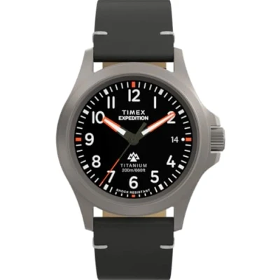 The Expedition Titanium is ready to go the distance, living up to the Timex legacy of fully equipping you for your adventures ahead while embodying the kind of tradition you can wear every day. This Analogue watch has a Calendar function: Date as well as Luminous Hands and Screw Down Crown High quality 21 cm length and 19 mm width a Black Leather strap with a Buckle Case diameter: 38 mm,case thickness: 12.5 mm, case colour: Grey and dial colour: Black Water resistant: 20 bars-Weight: 48 g The watch is delivered in an original gift box and has a warranty of 2 years