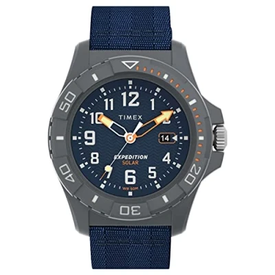 Elegant - Sporty and modern design, perfect for Men and comes with a Turnable bezel -The watch has a calendar function: Date and Solar Powered High quality 21 cm length and 21 mm width Blue Fabric strap with a Buckle Case diameter: 45 mm,case thickness: 13 mm, case colour: Grey and dial colour: Blue Water resistant: 5 bars -Weight: 50 g The watch is delivered in an original gift box and has a warranty of 2 years