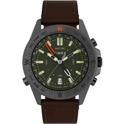 Crafted from 316L stainless steel, this timepiece is literally built for the long haul, from the curves of its rugged case to the tactile experience of its pushers. This Analogue watch has a calendar function: Date , Tide tracker , Compass , Luminous Hands and Luminous Numbers High quality 21 cm length and 21 mm width Brown Leatherl strap with a Buckle Case diameter: 43 mm,case thickness: 13 mm, case colour: Gun and dial colour: Green Water resistant: 10 bars -Weight: 92 g The watch is delivered in an original gift box and has a warranty of 2 years