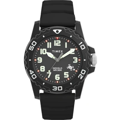 Round black 42 mm PC and GF case completed with black silicone two-piece strap and buckle clasp Black analog display, featuring full arabic numerals INDIGLO Light Up dial with perfect fit expansion band and date window, fits wrist circumferences 150-205 mm Acrylic lens Water resistant to 50m (165 ft): In general, suitable for short periods of recreational swimming, but not diving or snorkeling