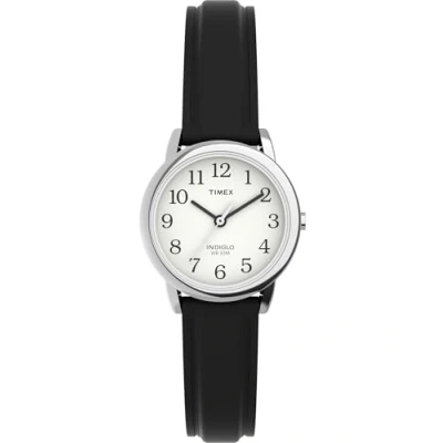 Adjustable black 12mm genuine leather strap fits up to 7.5-inch wrist circumference White easy-to-read dial with full Arabic numerals Silver-tone 25mm brass case with mineral glass crystal Indiglo light-up watch dial