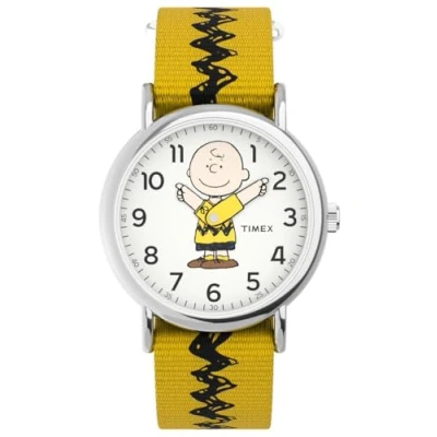 Round silver-tone 38mm brass case with mineral glass crystal, completed with a slip-through yellow fabric strap White analogue display, easy to read, featuring full arabic numerals. Charlie Brown’s arms move as the watch hands Quartz mouvement with three hands display INDIGLO Light Up Watch Dial Water resistant to 30m (98 ft in general, suitable for short periods of recreational swimming, but not diving or snorkeling)