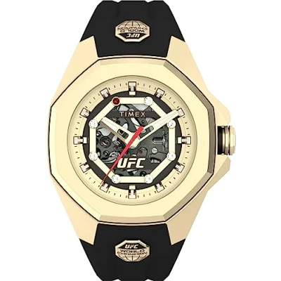 Round gold-tone 45 mm case completed with black pu strap and buckle clasp Gold-tone analog display, featuring baton markers Mechanical hand-wind watch, strap fits wrist circumferences 150-205 mm Mineral glass lens Water-resistant to 100m (330 ft): in general, suitable for snorkeling, as well as swimming, but not diving