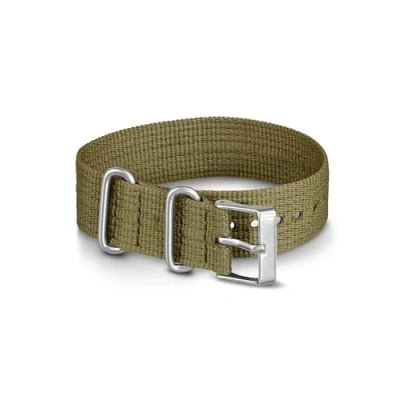 20mm wide olive green slip-thru strap with silver-tone buckle Fabric: nylon Designed for style T2N651 Fits Timex Weekender case sizes: 38mm, 40mm and 43mm