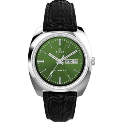 Presented in a 37mm stainless steel case, our Q Timex 1978 Reissue is packed with all the features that make our collection of Q Timex Reissue watches so popular. This analogue watch has a calendar function: day date This high-quality watch has a black leather strap (21 cm length and 19 mm width) with a pin buckle Case diameter: 37.5 mm, case height: 13 mm, case colour: silver, dial colour: green Waterproof: 5 bars -Weight: 52g The watch comes in an original gift box and has a 2 year warranty