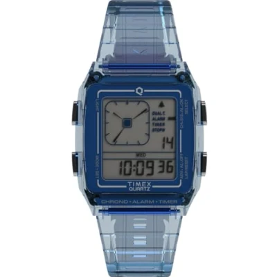 Call us nostalgic, but we love digging in our archives. This time we found a digital watch from the late 80s that we simply had to bring back. This digital watch has a calendar function: day date, stopwatch, dual time, countdown, alarm and light This high-quality watch has a blue plastic strap (20 cm length and 20 mm width) with a pin buckle Case measurement: 35 x 40 mm, case height: 9 mm, case colour: blue, dial colour: blue Waterproof: 3 bars -Weight: 32 g The watch comes in an original gift box and has a 2 year warranty