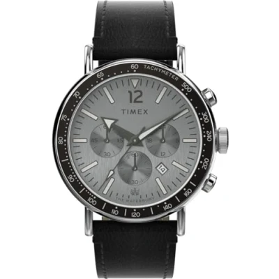 With its attention to detail, the Waterbury Standard Tachymeter Chronograph shines as one of our most sophisticated everyday watches. This chronograph has a calendar function: date, stopwatch, 24-hour display, luminous hands and tachymeter This high-quality watch has a black leather strap (21 cm length and 22 mm width) with a pin buckle Case diameter: 43 mm, case height: 12 mm, case colour: silver, dial colour: silver Waterproof: 10 bars -Weight: 75 g The watch comes in an original gift box and has a 2 year warranty