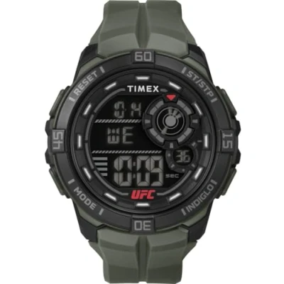 The ultimate timepiece for anyone living life in the Octagon and beyond, the UFC Rush features an impressive 52mm case and a robust and masculine construction that keeps up with your every move. This digital watch has a calendar function: day date, stopwatch, countdown, dual time, alarm and indigo light This high-quality watch has a green silicone strap (21 cm length and 22 mm width) with a pin buckle Case diameter: 52 mm, case height: 12 mm, case colour: black, dial colour: black Waterproof: 10 bars -Weight: 96 g The watch comes in an original gift box and has a 2 year warranty