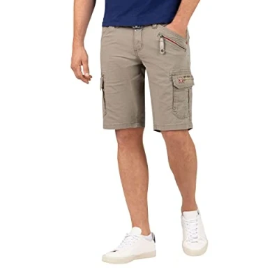 Regular fit with short legs Medium Waist Waistband with button, belt loops, zip Side pockets with coin and additional zip pocket Cargo bellows pockets with Velcro fastener
