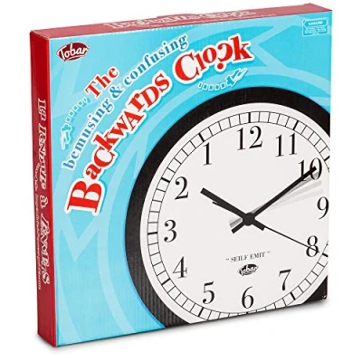 Wall clock that runs anti-clockwise, displaying the time in reverse All hands move backwards around the clock face, otherwise it works the same as a normal clock Instantly catches the attention of anyone nearby, making it a guaranteed conversation starter Clock is approx. 28cm, requires 1 x AA battery, packaged dimensions are W31cm x H31cm x D5cm All TOBAR products are rigorously tested and certified safe to the highest EU and UK standards