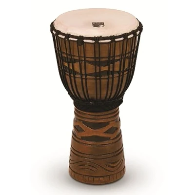 Traditional Djembe Lathe turned for uniform thickness Bowl interior features lathe grooves and rough-surfaced carvings to eliminate overtones Carved from a single piece of environmentally-friendly plantation grown mahogany Diameter: 10", Height: 20" (51 cm), Finish: African Mask