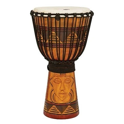 Traditional Djembe Lathe turned for uniform thickness Bowl interior features lathe grooves and rough-surfaced carvings to eliminate overtones Carved from a single piece of environmentally-friendly plantation grown mahogany Diameter: 12", Height: 24" (61 cm), Finish: Tribal Mask