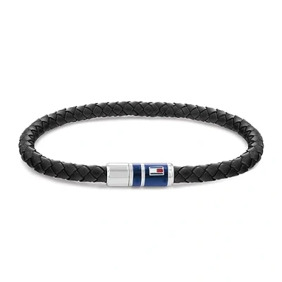Braided leather bracelet for men by Tommy Hilfiger Black braided leather with stainless steel closure Inner circumference: 19 cm Embellished with Enamel Tommy Hilfiger flag on the closure Closure: Magnetic