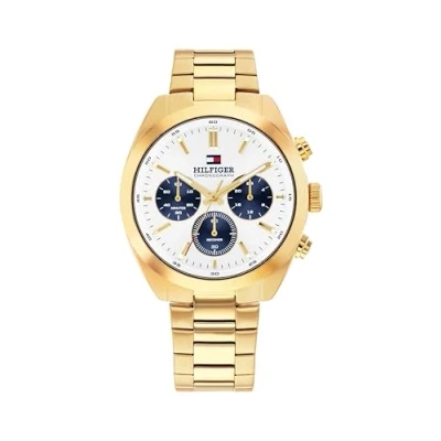 JAPANESE CHRONOGRAPH MOVEMENT FOR MEN – Tommy Hilfiger watch featuring a Japanese chronograph movement that blends precision with vintage-inspired style for a timeless, confident, and casually elegant look 40MM GOLD STAINLESS STEEL CASE WITH 10.5MM THICKNESS – Robust and contemporary design in gold stainless steel that adds sophistication and presence with comfort CREAM DIAL WITH SEMI-GLOSS FINISH AND NAVY BLUE SUBDIALS – Vertically brushed dial with applied indexes and navy blue subdials featuring a decorative finish that reflects light with a sophisticated effect GOLD STAINLESS STEEL BRACELET – Elegant gold stainless steel bracelet completing the design with a classic and refined style 5 ATM WATER RESISTANCE – Reliable daily protection against splashes, rain, and quick showers, ideal for an active and modern lifestyle