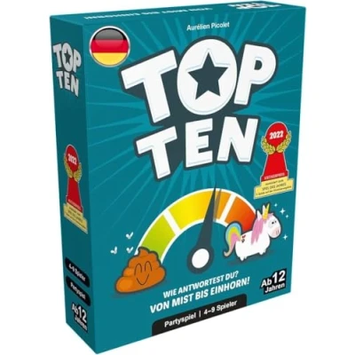 In the Top Ten board game, each player must find an answer on any topic. Using your secret number, such as impressive low (1) to fearsome (10), answer a topic In the cooperative card game, round captains select a theme. The difficult task of the cloak is to guess the order of answers, from the smallest to the largest. Open your digital card when your term is named. Whenever an uncovered number is smaller than the previous card, a plate from the unicorn zone moves to the poo area If the number is greater than the previous one, nothing happens. If all the dishes are in the area of feces, they lose. After the fifth round in the Unicorn Zone, you win 4-9 players | Ages 12+ | 30 minutes per game | Author: Aurélien Picolet | German game, Manufacturer: Asmodee gmbH