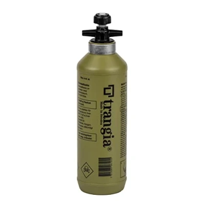 Trangia Fuel Bottle for Spirit, Petrol, Diesel and Petroleum Heavy duty polyethylene bottle with tightly sealable Trangia pourer Volume: 0.3 litres. Dimensions: approx. 119 x 65 mm. Weight: approximately 95 g. Volume: Volume: 0.5 litres. Dimensions: approx. 235 x 65 mm. Weight: approximately 115 g. Volume: 1 litre. Dimensions: approx. 290 mm x 80 mm. Weight: approximately 160 g.