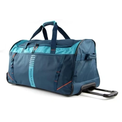 BASICS ACTIVE: The trolley travel bags are the perfectly organized space miracle: thanks to their material and volume flexibility, they are versatile and can be used for (car) travel, as a sports bag, for visits to clinics, swimming pools and spas INTERIOR: The main compartment with large opening and 2-way zipper and the additional outer compartments of the trolley bag offer plenty of storage space and simplify packing PRACTICAL: The 2 smooth-running wheels make transportation easy. The flexible material and the fully retractable light metal telescopic handle make the bag easy to stow away SCOPE OF DELIVERY: 1 x travel trolley / sports bag with wheels; dimensions 36 x 71 x 35 cm; volume 86 liters - luggage for approx. 2 weeks; weight 2.4 kg; material polyester; color petrol/orange TRAVELITE: The Hamburg-based family business has been providing travelers with lightweight, robust and functional leisure and travel luggage since 1949