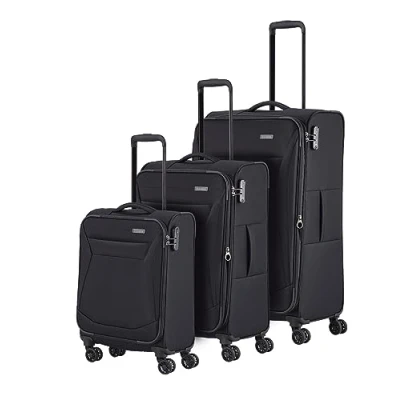 CHIOS: Timeless, practical, functional and so beautifully light - the perfect soft luggage for the family EQUIPMENT: With four double castors, a height-adjustable light metal frame, additional edge protection and a clip-on function for hand luggage, the trolley cases are optimally equipped INTERIOR: The large front pocket and the well thought-out interior division with packing straps and divider offer plenty of storage space. In sizes L/M, the volume can be expanded using the integrated expansion pleat SCOPE OF DELIVERY: 1 x travel suitcase set soft luggage sizes L (78 cm), M (67 cm) and hand luggage dimensions: 55 x 37 x 20 cm meets IATA standard; material polyester; color black; all sizes with combination lock TRAVELITE: The Hamburg-based family business has been providing travelers with lightweight, robust and functional travel and leisure luggage since 1949