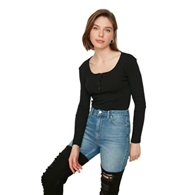 Material Composition: 55% Polyester, 43% Cotton, 2% Elastane Occasion: The Schwarz Slim fit Blouses is perfect for Casual/Daily occasions. Our Collection offers affordable fashion for every occasion and style – from casual & relaxed to smart & elegant. Trendyol Collection translates the latest runway trends into wearable outfits for your wardrobe. Design: This Basic Knit Blouse for Women has Long sleeve Button placket Plain pattern. It is Slim fit fit. If you are in between size,please size up. Wash at a maximum temperature of 30°C. Do not use bleach. Do not tumble dry. Iron at low temperature. Do not dry clean.