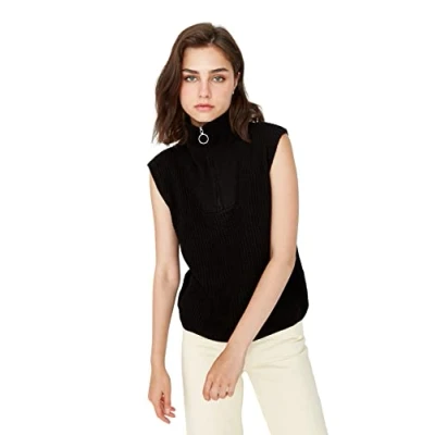 Material Composition: 100% Acrylic Occasion: The black Regular fit Sweater is perfect for Casual/Casual occasions. Our Collection offers affordable fashion for every occasion and style – from casual & relaxed to smart & elegant. Trendyol Collection translates the latest runway trends into wearable outfits for your wardrobe. Design: This Basic Knitwear Sweater for Female has Sleeveless Standing collar Plain pattern. It is Regular fit fit. If you are in between size,please size up. Please check the product label for detailed care instructions.