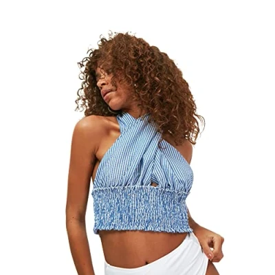 Material Composition: 75% Polyester, 25% Cotton Occasion: The Blue Regular fit Blouse is perfect for Beachwear occasions. Our Beachwear Collection offers affordable fashion for every occasion and style – from casual & relaxed to smart & elegant. Trendyol Collection translates the latest runway trends into wearable outfits for your wardrobe. Design: This Double-breasted Knitted Blouse for Women has Zero Sleeve Halterneck Striped pattern. It is Regular fit fit. If you are in between size,please size up. Wash at a maximum temperature of 30°C. Do not use bleach. Do not tumble dry. Do not iron. Do not dry clean.