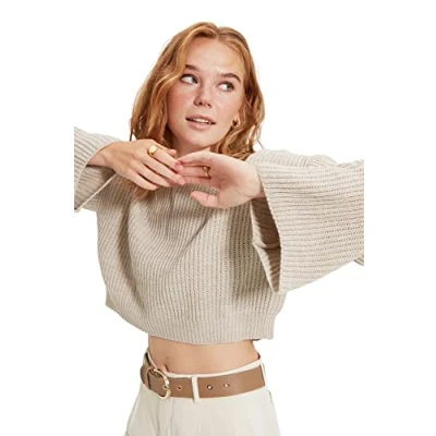 Trendyol Women Oversize Basic Crew Neck Knitwear Sweaters, Stone, M