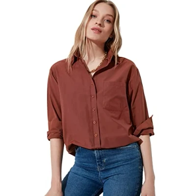 Trendyol Women's Oversize Basic Collar Woven Shirt, Brown, 38