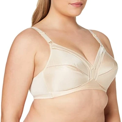 Style: classic women's bra with timelessly beautiful design Colour: elegant beige tone called 'complexion' Comfort: Soft, stretchy spandex fabric for a comfortable fit Minimizer design: visually reduces cleavage by one cup size EASY CARE Machine washable for easy cleaning Craftsmanship: standard back style hook and eye closure