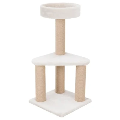Colour: light grey Covered in soft plush fabric; posts wrapped in jute (3.5 inches in diameter); platform (15.3 x 15.3 inches); platform with backrest (12.7 inches in diameter); dimensions: 39.2 x 38.7 x 81.9 cm With plush cover and sisal scratching surface Posts wrapped with jute