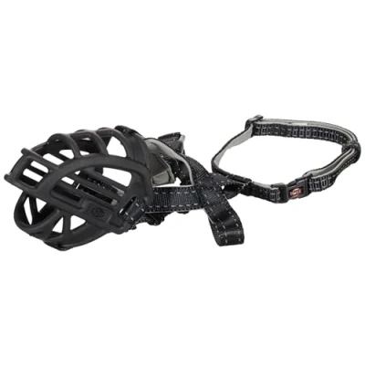 secure due to threefold fastening. continuously adjustable forehead strap and neck strap as well as nape loop, with reflective stripes. Particularly comfortable to wear due to ergonomic fit, flexible silicone that is stable in shape and neoprene-padded straps in face and neck areas. Muzzles prevent biting, no problems with panting, drinking and feeding treats.