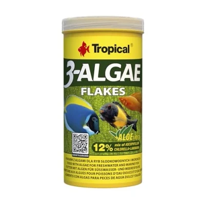 Flake food with 3 different algae: Chlorella (Chlorella vulgaris), Ascophyllum nodosum and Laminaria digitata, also known as kelp or seaweed Unsaturated fatty acids, protein and vitamins of chlorella ensure the fish an excellent condition, intensive growth and vitality Chlorophyll inhibits the development of unwanted bacteria in the digestive tract and thus prevents infections. Together with zeolite, it promotes the excretion of toxins from the digestive tract of fish. Aloe extract improves immunity and stimulates bacterial flora in the gastrointestinal tract Feeding recommendation: several times a day in small portions