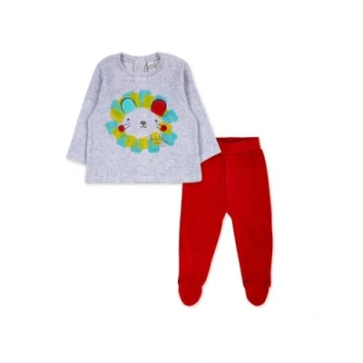 Boy's tundosed two-piece set. Grey t-shirt with lion print. Red trousers. P'tit Zoo Collection