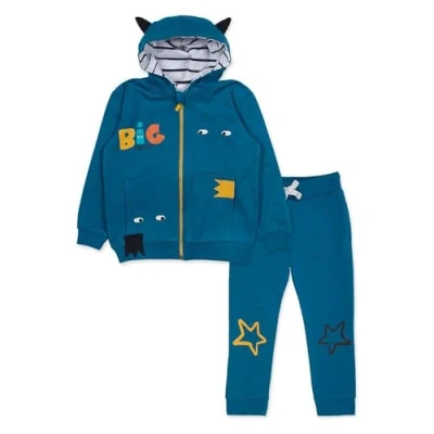 Boys' two-piece plush set. Blue jacket with monster print, zip front closure and hood. Blue trousers with star print and drawstring waist. Big Hugs Collection