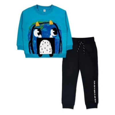 Boys' two-piece plush set. Fleece sweatshirt, blue with monster. Black plush trousers with white letter print and drawstring waist. Big Hugs Collection