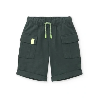 Green plush bermuda shorts with front pockets, elastic waist and drawstring for boy. Savage Spirit Collection