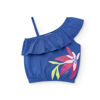 Blue jersey t-shirt with flower print and ruffle for girls. Acid Bloom Collection Machine washable at max. 30ºC delicate cycle, do not bleach, do not tumble dry, hang or line dry, iron at 110ºC max, do not dry clean