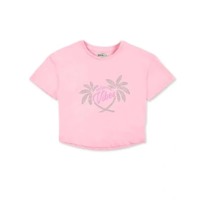 Pink jersey t-shirt with printed message and sequins for girls. Californian Chill Collection Machine washable at max. 30°C short spin, do not bleach, do not bleach, do not tumble dry, air dry, iron at 110ºC max, do not dry clean