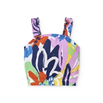 Girls lilac knitted tank top with coloured print and smocked waist. Rockin the Jungle Collection Machine washable at max. 30ºC delicate cycle, do not bleach, do not tumble dry, hang or line dry, iron at 110ºC max, do not dry clean