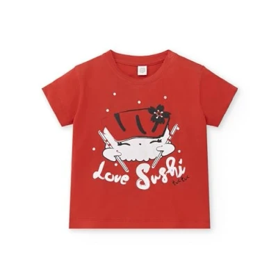 Sushi printed red jersey t-shirt for girls. Hey Sushi Collection Machine washable at max. 30ºC delicate cycle, do not bleach, do not tumble dry, hang or line dry, iron at 110ºC max, do not dry clean