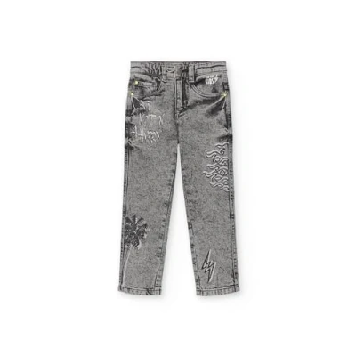 Grey denim trousers with printed motifs and button front closure for boys.Race Car Collection.