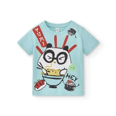 Blue jersey t-shirt with panda and sushi print for boy. Hey Sushi Collection Machine washable at max. 30ºC delicate cycle, do not bleach, do not tumble dry, hang or line dry, iron at 110ºC max, do not dry clean
