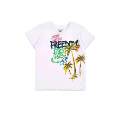 White knitted t-shirt with colourful motifs and lettering "Friends" for boys. Urban Attitude Collection Machine washable at max. 30°C short spin, do not bleach, do not bleach, do not tumble dry, air dry, iron at max. 110 °C, do not dry clean